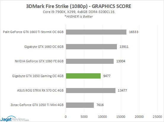 Berikut skor 3DMark Fire Strike (default preset 1080p) dari Gigabyte GTX 1650 Gaming OC 4G dan pembandingnya: