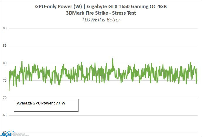 Dari rating 75W yang diberikan, tanpa perubahan pada power limit-nya, Gigabyte GTX 1650 Gaming OC 4G mencatatkan 77W rata-rata pada sensor GPU-only power. Berasumsi sensor GPU-only power ini akurat, ini berarti card tersebut hampir selalu berjalan pada batas atas power limit-nya.
