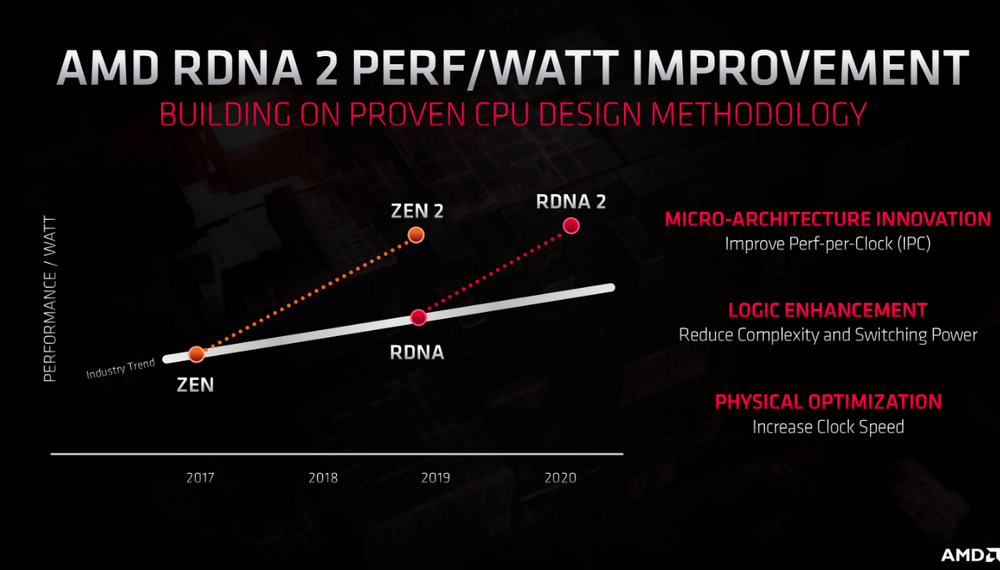 AMD mengklaim RDNA2 akan memberikan peningkatan instruction per clock, penurunan konsumsi daya, dan pada saat yang sama masih menunjukkan peningkatan clockspeed.