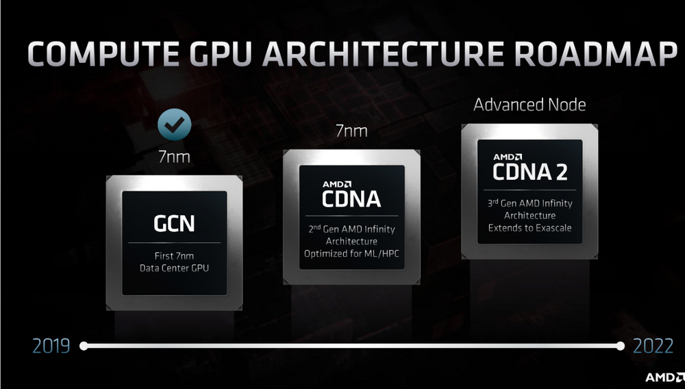 AMD memperkenalkan CDNA : sebuah arsitektur GPU yang dirancang secara khusus untuk bekerja optimal pada proses Compute. CDNA akan memiliki fokus pengembangan yang berbeda dengan RDNA, dimana RDNA (seperti Navi) memiliki optimalisasi pada skenario gaming.
