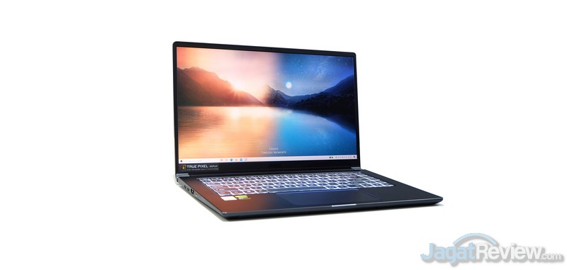 Laptop memiliki desain stylish dan elegan dengan bodi yang cukup ramping, dengan pilihan warna Carbon Grey. Laptop memiliki dimensi 35.6 x 23.3 x 1.59 cm dengan bobot laptop 1.73 kg dan charger seberat 330 gram, membuatnya jadi laptop content creator yang tipis dan ringan di kelasnya.