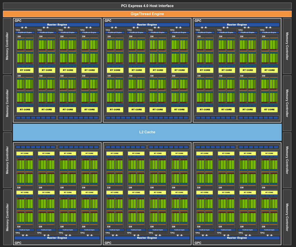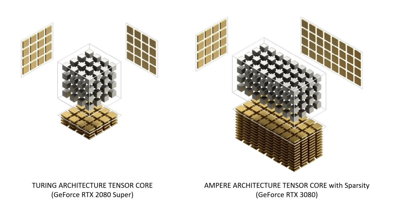 RT Core yang baru di Ampere ini diklaim bisa melakukan kalkulasi Ray/Triangle Intersection hingga 2x lebih banyak dari 1st Gen RT Core pada Turing, serta Tensor Core baru dengan dukungan berbagai tipe data seperti TensorFloat-32 / bfloat16 misalnya, dan juga diklaim memiliki throughput lebih besar berkat dukungan Neural Network Sparsity .