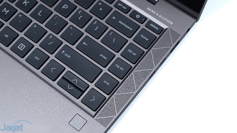 Di sisi kanan dan kiri Keyboard, terdapat stereo speaker yang ditune oleh Bang & Olufsen, dimana kedua speaker ini mengarah langsung ke pengguna sehingga memberikan kualitas audio yang jernih tanpa halangan. Speaker stereo ini juga dilengkapi dengan Software HP Audio Control untuk mengatur Audio Profile.