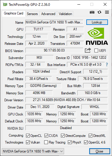 Di sektor grafis, MSI membekali laptop ini dengan NVIDIA GeForce GTX 1650 Ti Max-Q. Ini adalah GPU Nvidia dengan basis Turing 12 nm yang memiliki 1024 CUDA Cores, dengan 4 GB GDDR6. Base Clock-nya yaitu sebesar 1035 MHz dengan Boost Clock mencapai 1200 MHz