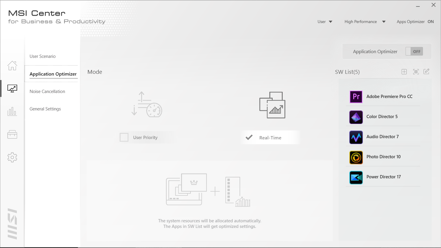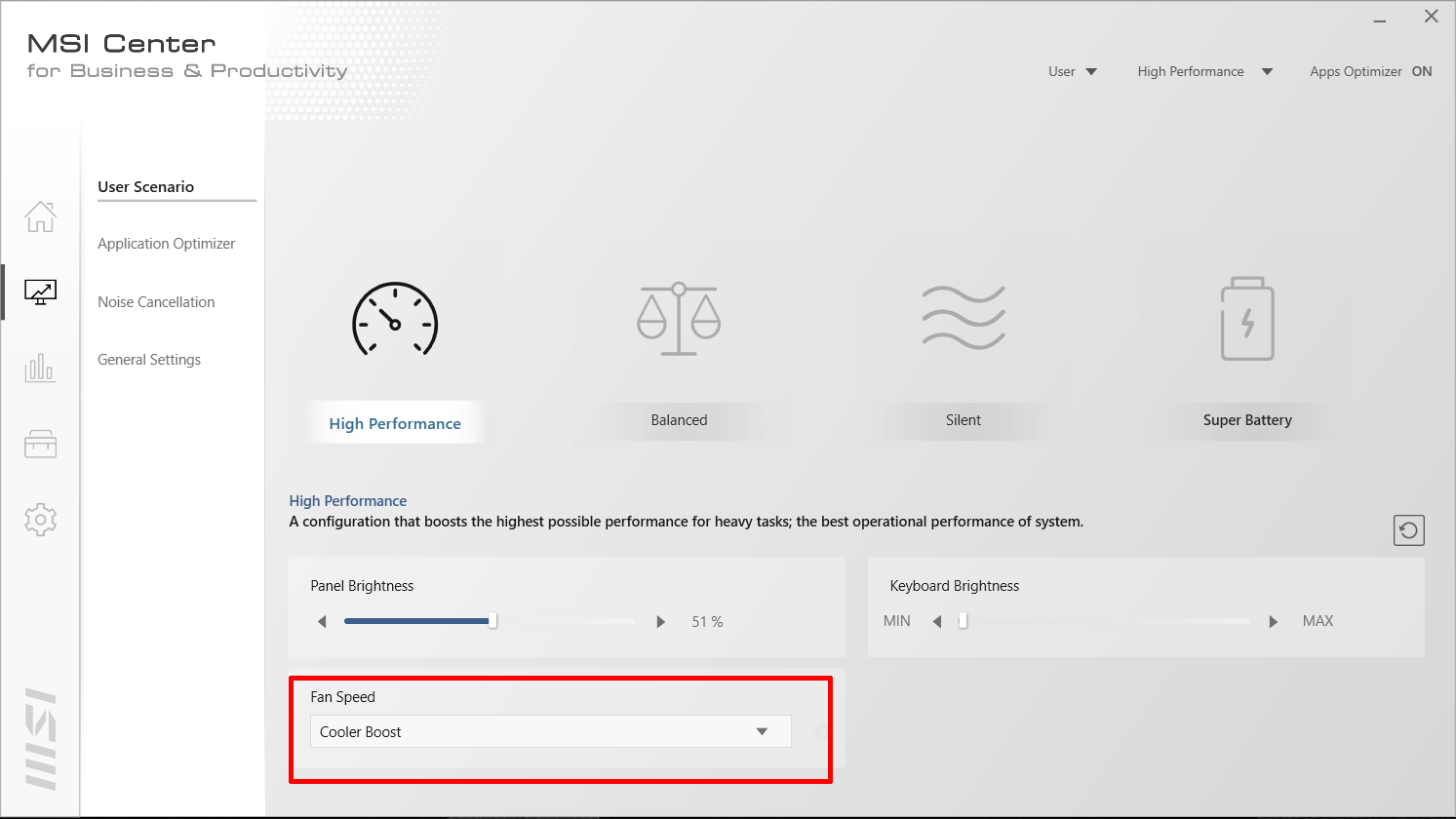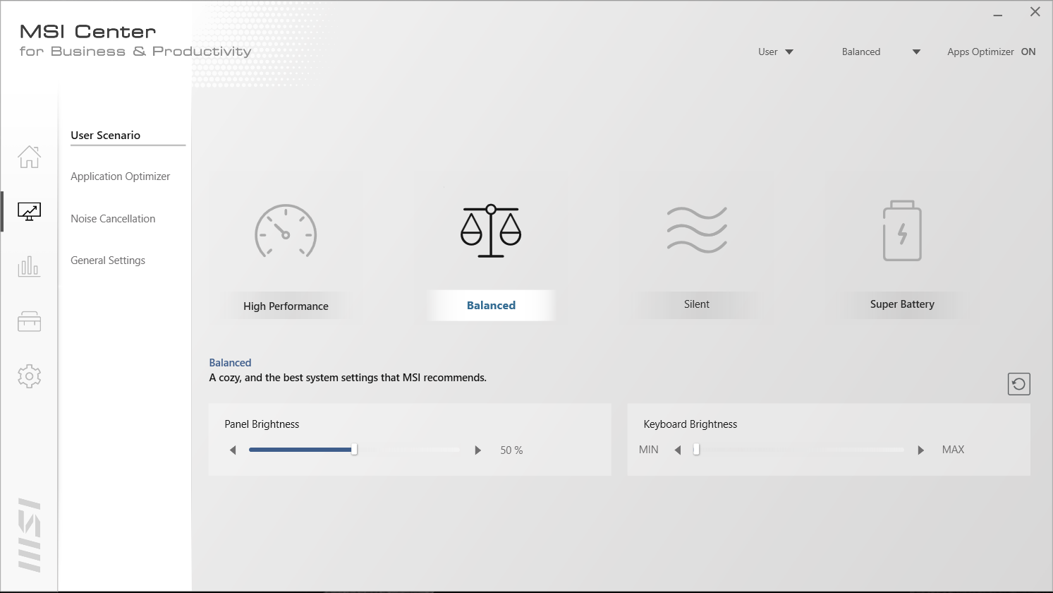MSI Summit E15 juga dilengkapi dengan Software MSI Center for Business and Productivity. Terdapat 4 mode performa “User Scenario” yang dapat diubah, yaitu High Performance, Balanced, Silent danSuper Battery.