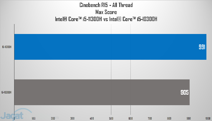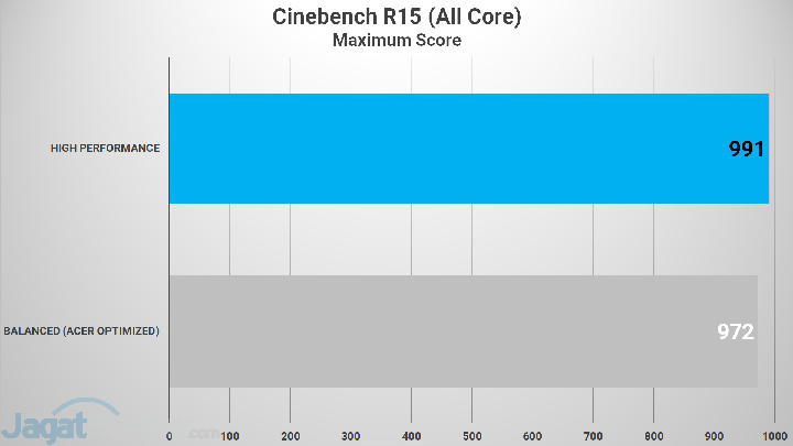 - Burst Score Core i5 11300H tampak mampu mencapai 972 poin di mode Balanced (Acer Optimized) dan 991 poin di mode High Performance. Skor yang memang kami harapkan dari prosesor Intel Core i5 Generasi ke-11.