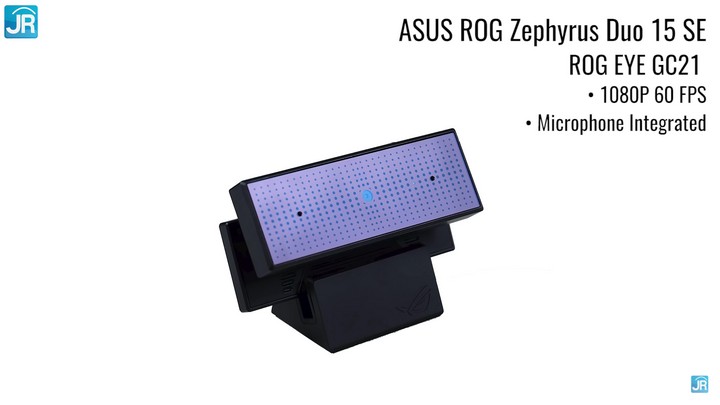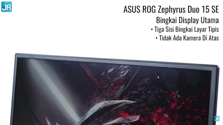 Bingkai layar 3 sisi yang sangat tipis, dan tidak terdapat webcam pada bagian atas layar. Untungnya sudah disertakan webcam terpisah yaitu ROG EYE GC21 di paket penjualan. Ini adalah kamera 1080p 60fps serta memiliki built-in microphone.