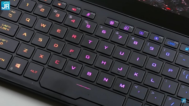 Untuk keyboardnya, perangkat ini menggunakan desain dan Layout Keyboard khas ROG Zephyrus. Keyboard memiliki Travel Distance 1.4 mm, dan memiliki fitur N-key rollover yang memastikan sistem mengenali Input dari penekanan tombol secara bersamaan. Ini memang biasa tersedia di laptop gaming, karena biasanya gamer akan menekan beberapa tombol secara bersamaan.