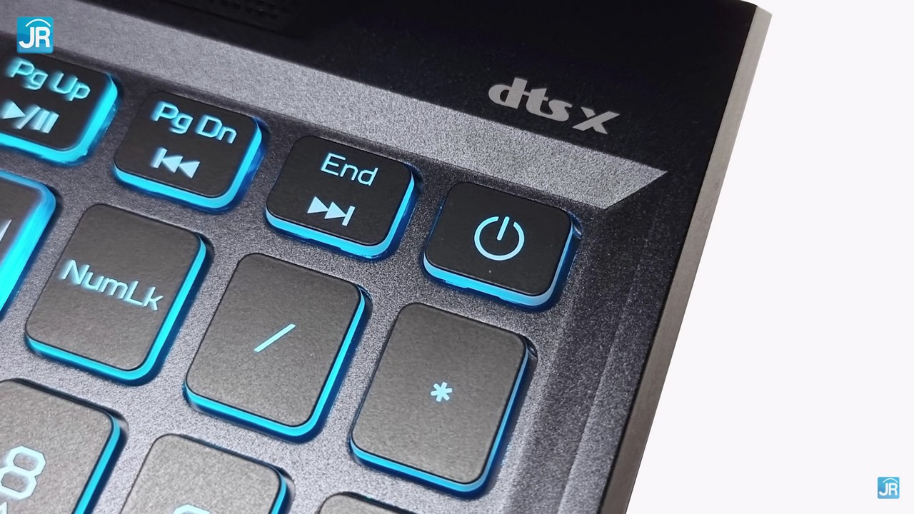 Tombol power menyatu dengan layout keyboard. Keyboard memiliki backlit RGB dengan 4 zona warna dan 4 tingkat kecerahan. Pengaturan warna dapat dilakukan di software PredatorSense.