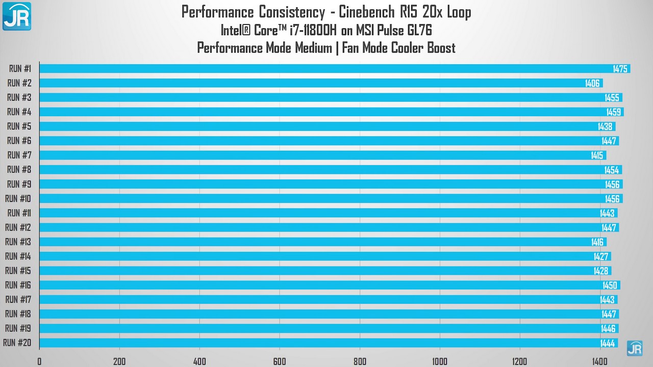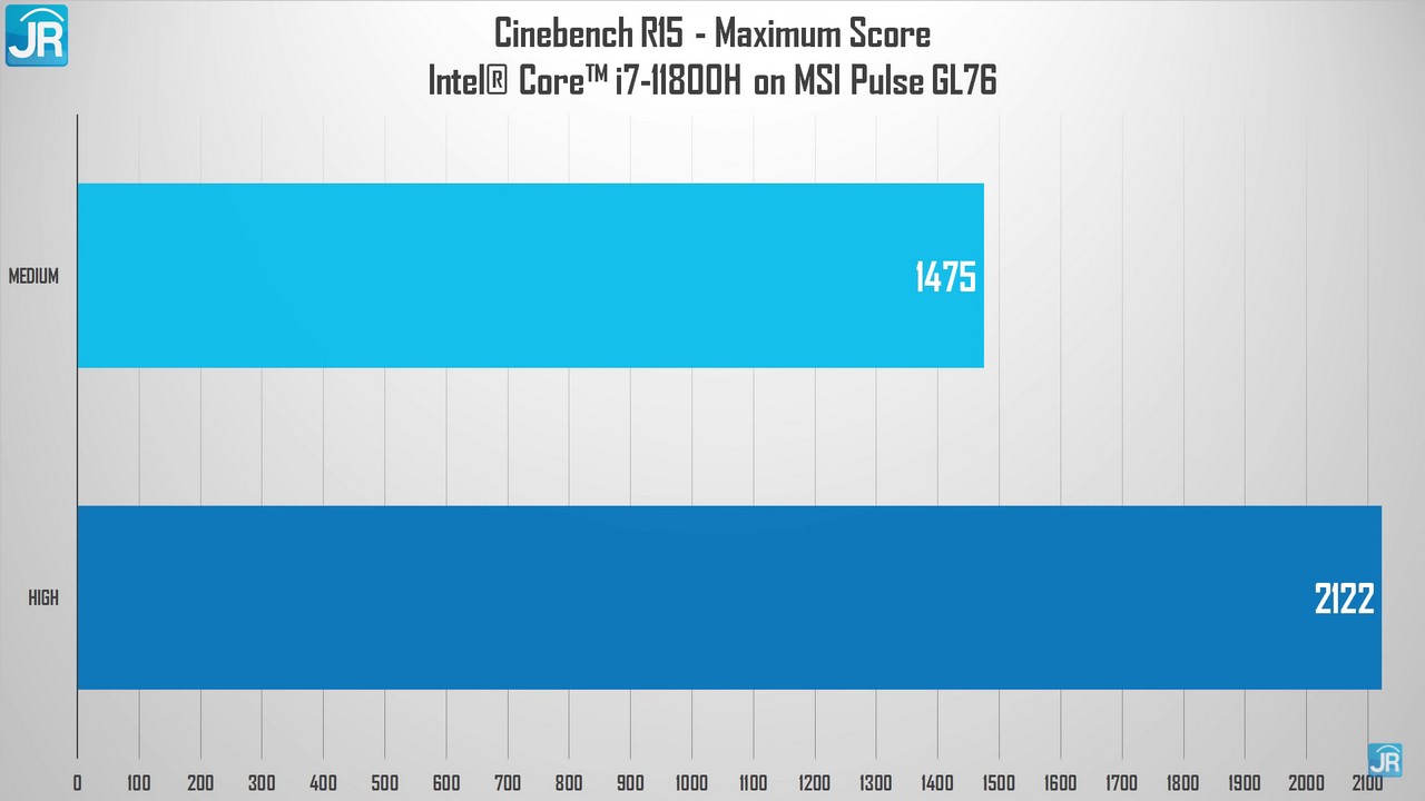 - Di mode Medium, terlihat bahwa skor tertinggi yang dapat diraih oleh Intel Core i7-11800H berada di 1475 poin