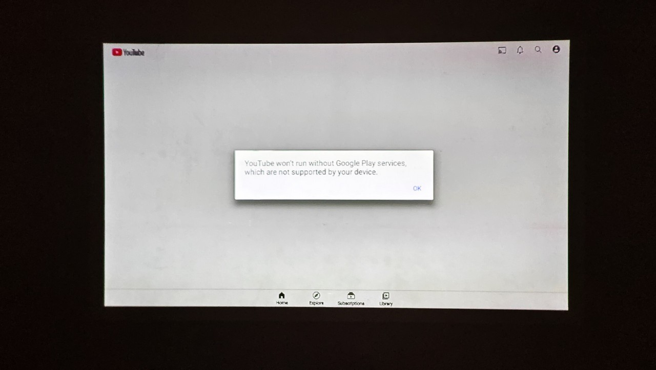 Sementara untuk layanan streaming yang wajib yaitu YouTube, sayangnya meskipun aplikasi tersebut berhasil diinstal tapi tidak dapat berjalan, karena membutuhkan layanan Google Service.