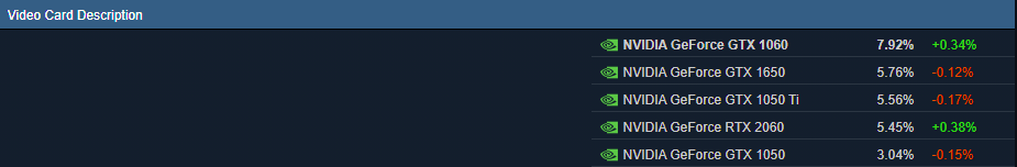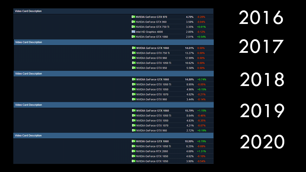 Cukup mengejutkan bahwa RTX 2060, dengan banyak fitur modern seperti DLSS maupun ray tracing, belum mampu menggeser posisi GeForce GTX 1060 di Steam Survey. Hal ini juga mungkin disebabkan oleh kondisi saat ini, di mana harga graphics card jadi sangat tidak wajar. Ini mungkin jadi pemicu mengapa GPU tua seperti ini masih kuat bertahan di puncak.