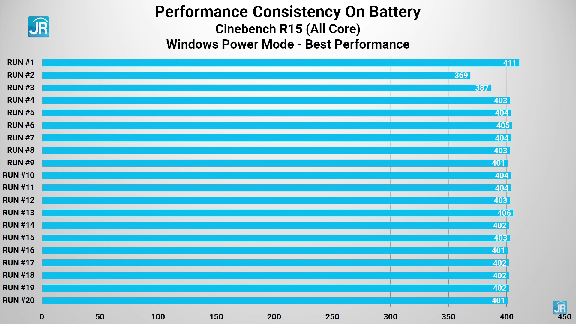 - Pergerakan skor di Laptop ini cukup unik dimana skor sempat berada sedikit di atas 400 poin di Run pertama lalu kemudian turun sedikit ke 380-390 poin di Run ke 2 hingga ke 6.