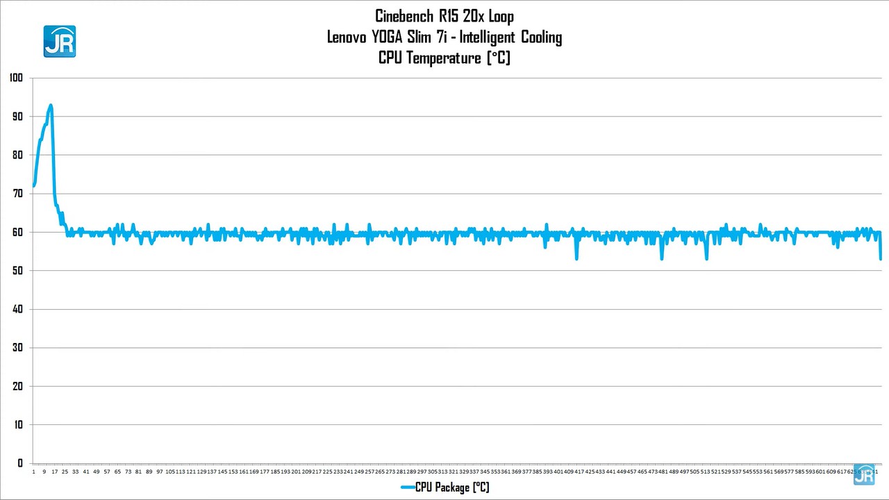 - Di mode Intelligent Cooling terlihat bahwa suhu sempat spike ke 92 derajat saat run pertama, kemudian turun dan stabil di kisaran 57-62 derajat Celcius