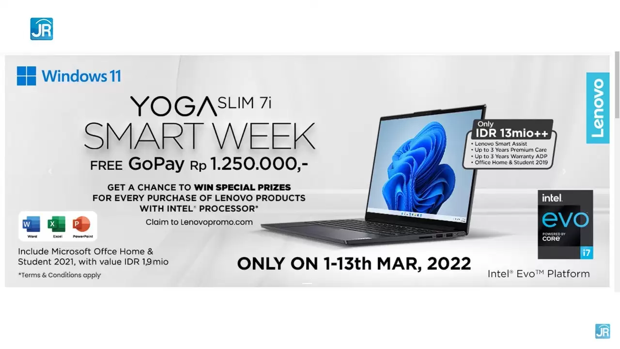 Lenovo juga memberikan promo menarik lainnya yaitu Setiap pembelian produk Yoga Slim 7i ini, pembeli berhak menerima saldo Go-Pay Rp 1.250.000. Selama persediaan Gopay masih ada.