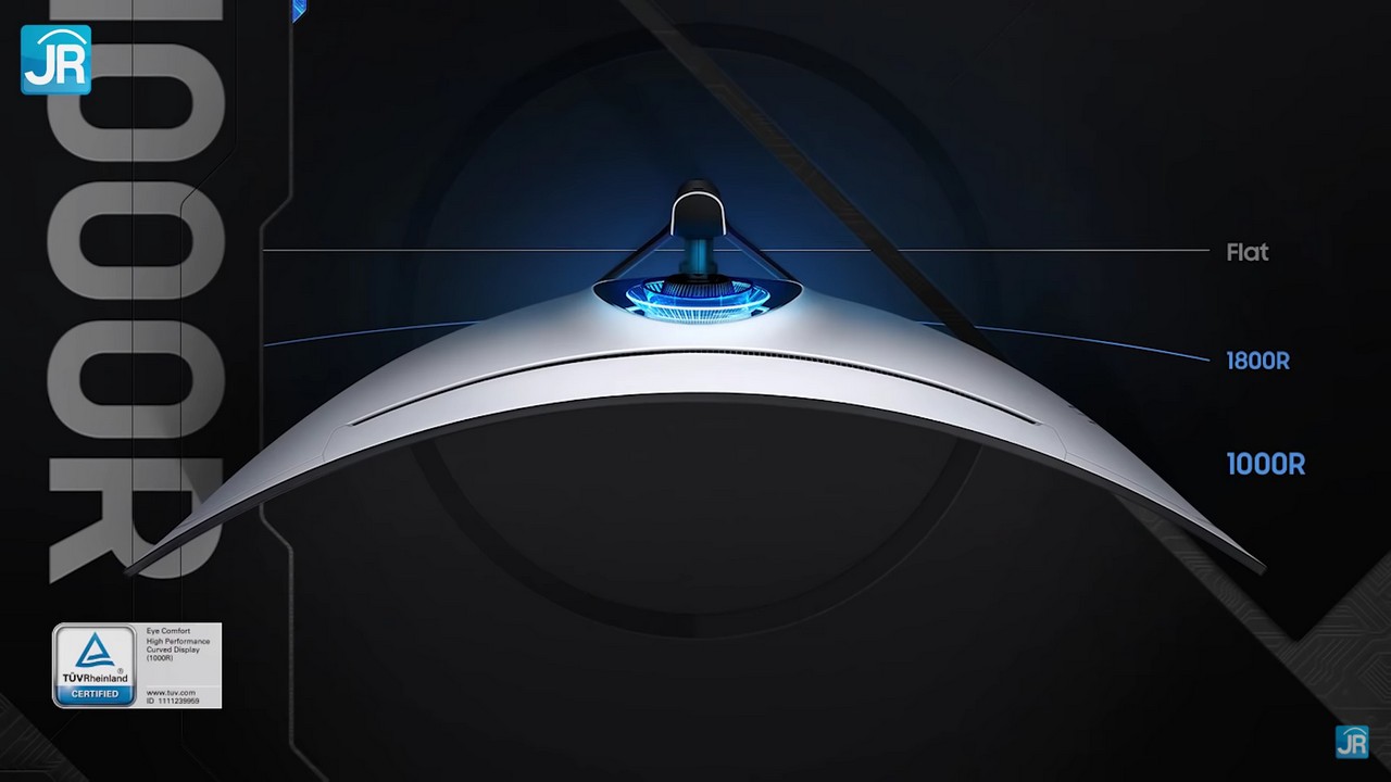 Layar curved dengan tingkat kurvatur 1000R ini terlihat sangat melengkung. Ini akan membuat jarak mata dan monitor selalu sama/tidak berubah. Ini dengan asumsi kepala kita berposisi normal di atas meja, di tengah, dan menghadap monitor.
