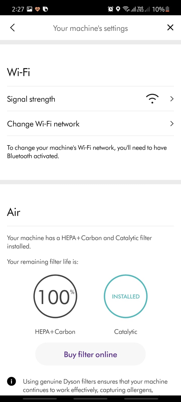 Fungsinya sebagai penyaring udara dapat dipantau melalui layar kecil yang tersedia, ataupun melalui aplikasi smartphonenya yaitu Dyson Link. Apabila kualitas udara buruk akan berwarna kuning bahkan merah. Tapi jika udara bersih akan berwarna hijau.