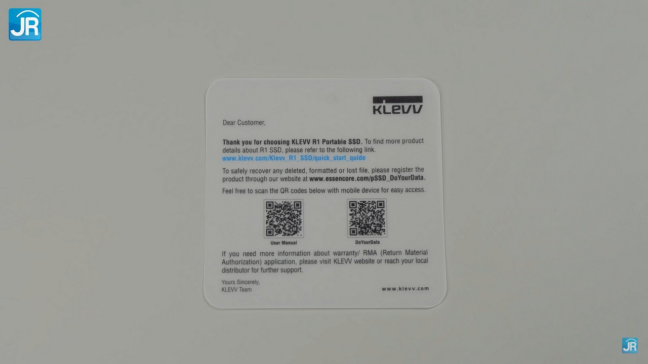 • Kartu ucapan terima kasih dari Klevv yang berisikan link QR Code untuk user manual & software DoYourData.