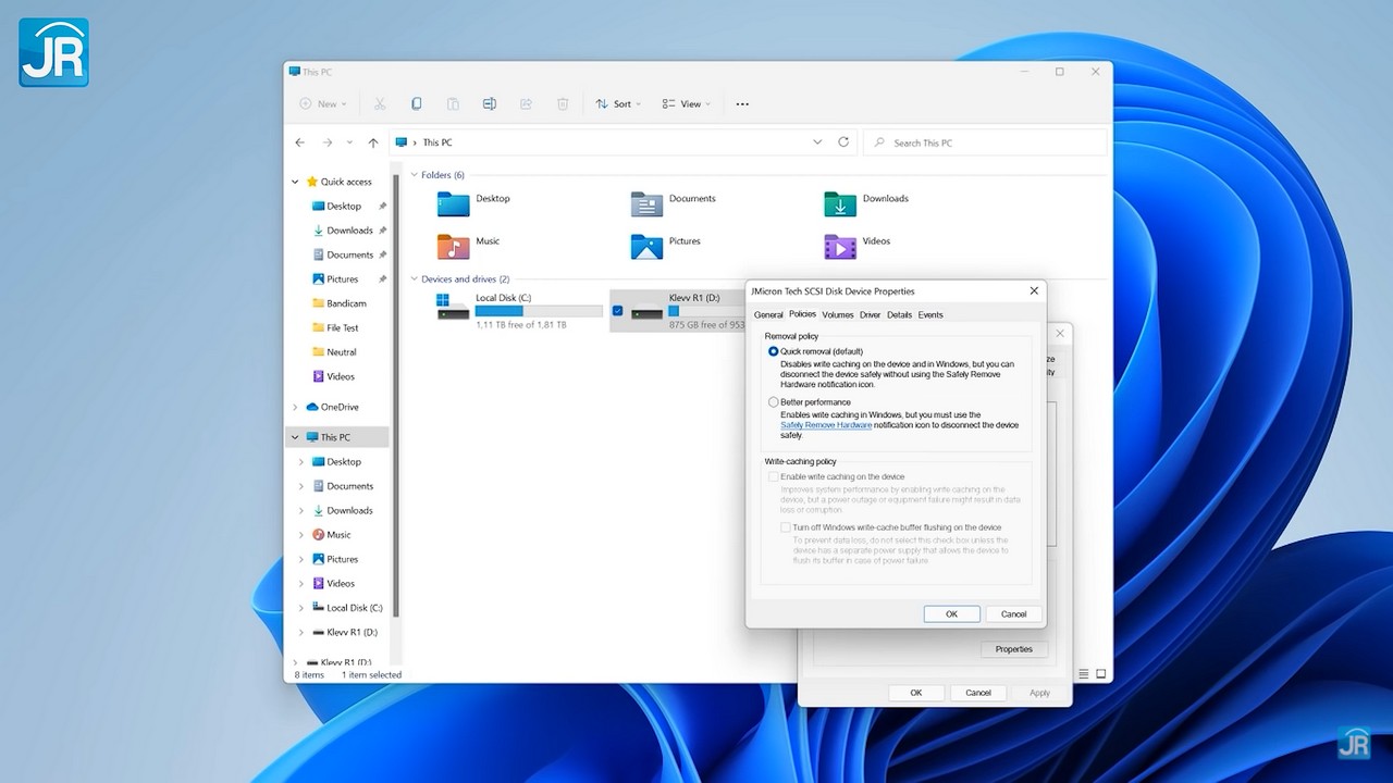 Nah, bagi kalian yang menggunakan OS Windows 10 setelah versi 1809. ternyata ada cara untuk meningkatkan performa Transfer Speed dari external storage ini dengan cara mengubah setting SSD Klevv di Device Manager. Pada menu Policies kita harus mengubah konfigurasi Removal Policy dari Quick Removal ke Better Performance.