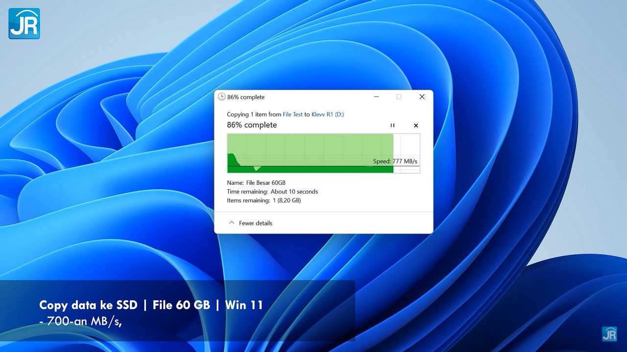 Lalu kami uji coba kembali melakukan transfer file sebesar 60 GB, dan hasilnya ternyata kecepatan langsung meningkat sekitar 700-an MB/s. Memang, kecepatan real ini tidak sama dengan kecepatan teoritis dari pengujian sintentis. Namun, kecepatan yang ditunjukkan oleh SSD Klevv R1 ini sudah tergolong kencang untuk sebuah Storage Portable.