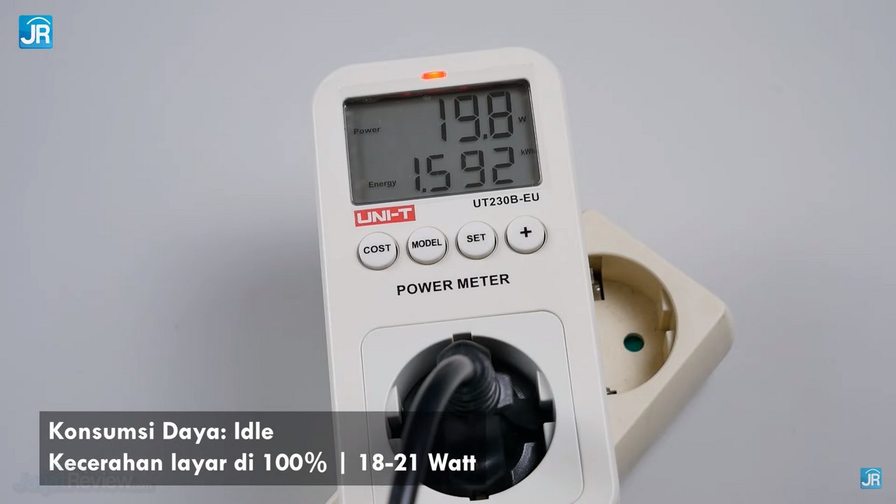 - Pada tingkat kecerahan layar di 100%, konsumsi daya tertinggi bisa mencapai 60 Watt yang kemudian turun secara perlahan hingga titik stabilnya dikisaran 41-42 Watt
