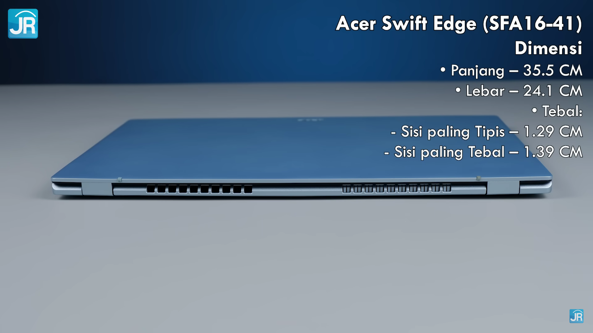 Acer Swift Edge memiliki form factor clamshell dengan material Magnesium Alloy, yang membuatnya tetap punya bodi yang kokoh meskipun punya dimensi yang tipis dan ringan. Warna yang ditawarkan yaitu Flax White, yang mana warna ini tampak seperti warna biru muda yang cerah di mata kami.