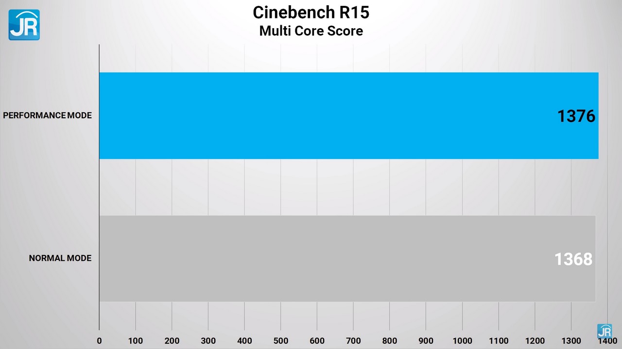 Di mode Normal, skor tertinggi yang dicapai adalah 1368 poin dan 1376 poin saat mode Performance digunakan. Hasilnya ternyata tidak jauh berbeda