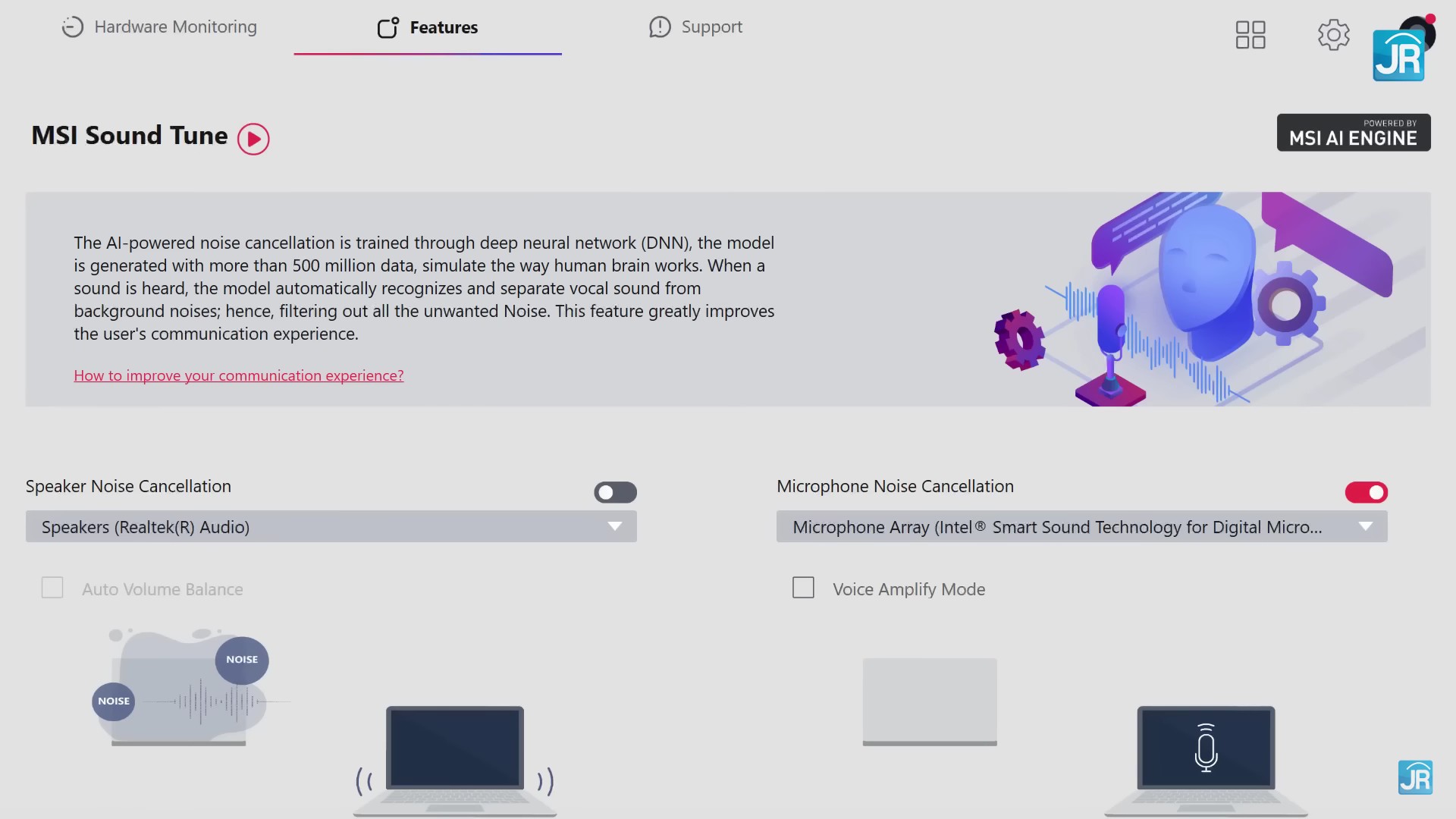 Sementara itu, untuk meningkatkan pengalaman pengguna dalam berkomunikasi, perangkat ini juga dilengkapi dengan mikrofon yang menggunakan teknologi Noise Cancelling. Fitur ini dapat diatur dan disesuaikan melalui software MSI Center, sehingga pengguna dapat mengatur tingkat pengurangan kebisingan sesuai dengan kebutuhan dan lingkungan sekitar.