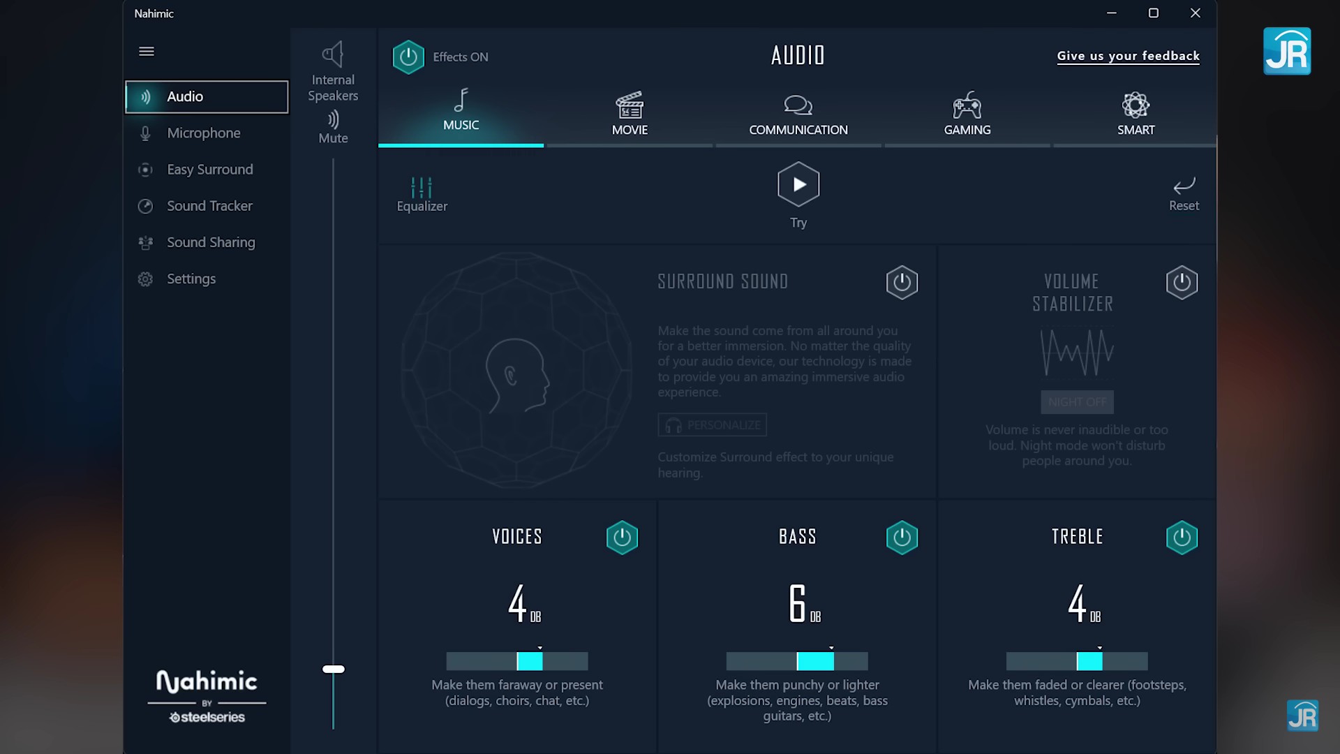 Laptop ini menggunakan Trilateral Speaker Design by DYNAUDIO dengan six-speaker sound system. Terdapat Software Nahimic untuk mengubah preset audio dan equalizer.