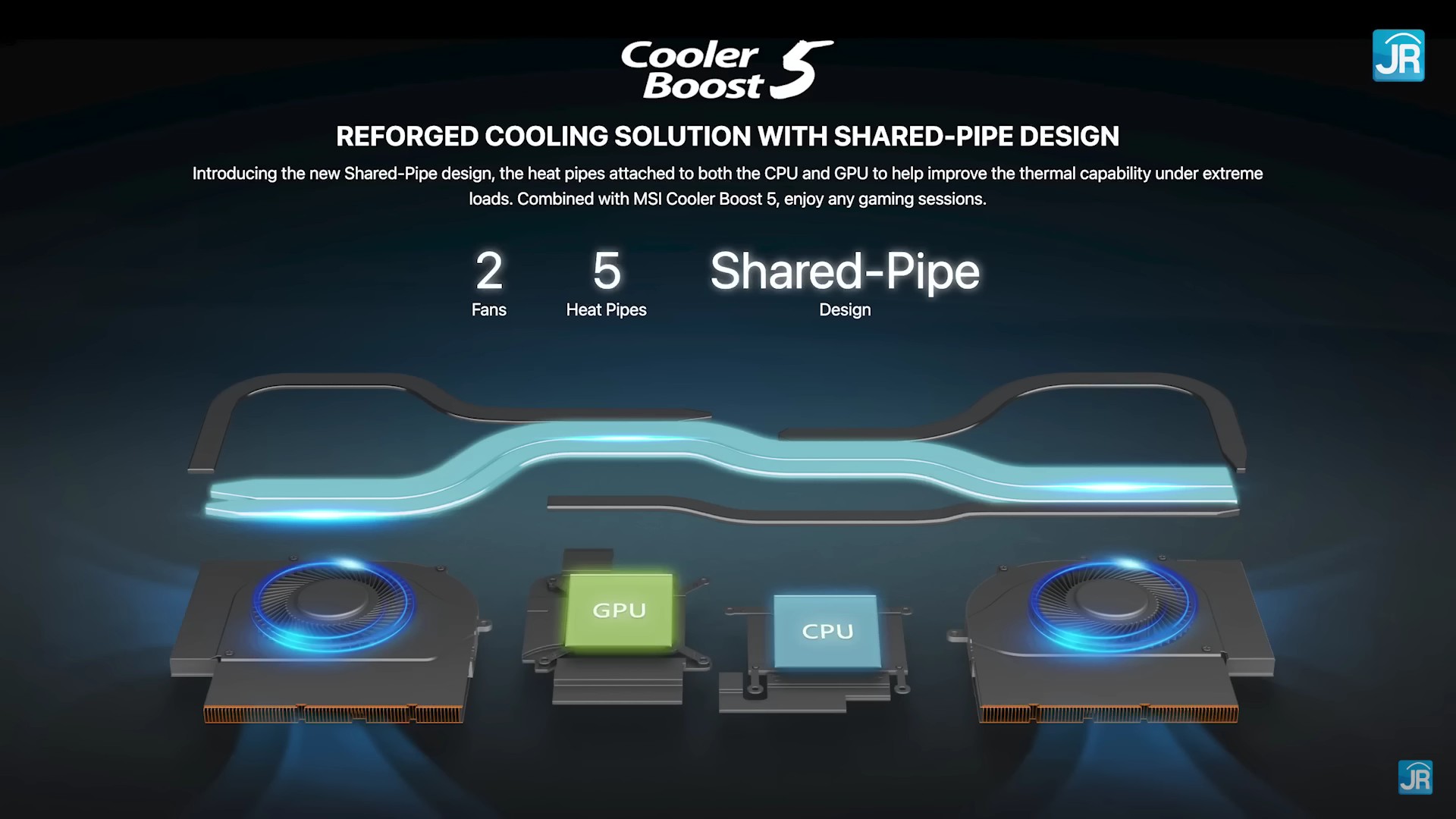 Laptop ini menggunakan sistem pendingin Cooler Boost 5 dari MSI dengan dua fan dan lima heatpipes. Ini memberikan peningkatan airflow 13% dan area pelepasan panas 15%. Sirkulasinya memiliki arah Intake dari bawah, exhaust ke arah samping dan belakang.