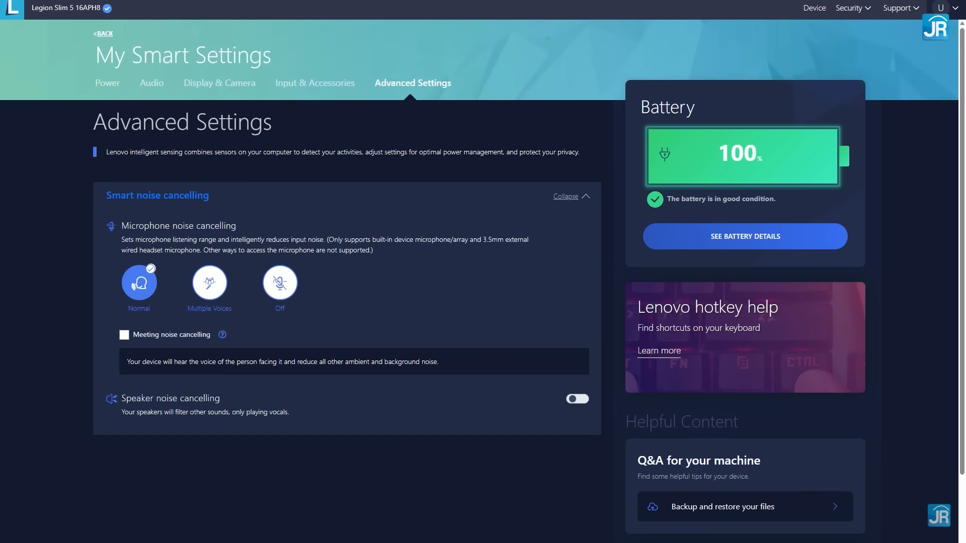 Laptop dilengkapi kamera 1080P @30 FPS dengan dua mikrofon di sisi kanan dan kiri. Fitur Smart Noise Cancellation untuk mikrofon dapat diaktifkan melalui Lenovo Vantage, sedangkan GPU NVIDIA memungkinkan fitur Noise Removal melalui NVIDIA Broadcast.