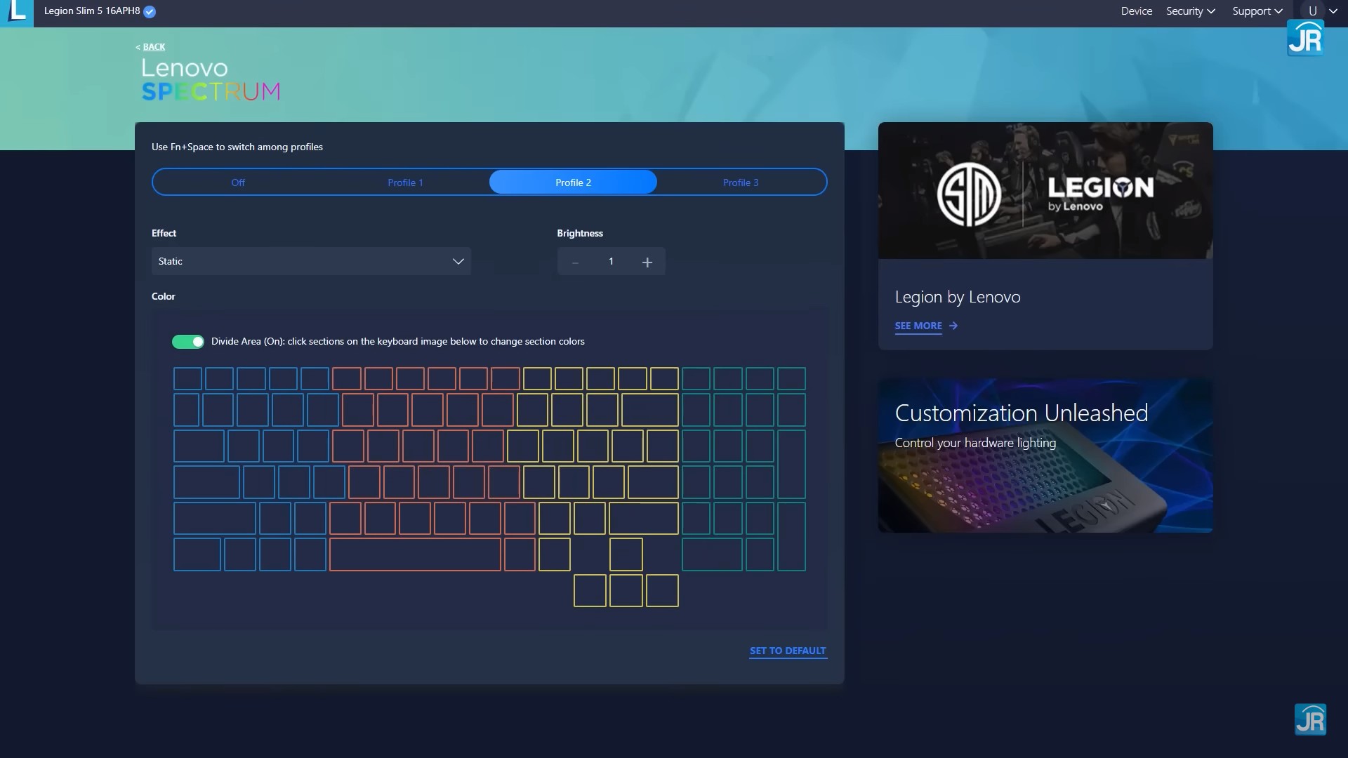 Tombol panah tetap berukuran sama dengan tombol lainnya, memberikan kenyamanan saat digunakan. Keyboard ini dilengkapi dengan lampu backlit RGB dengan empat zona warna yang dapat diatur melalui Lenovo Vantage.
