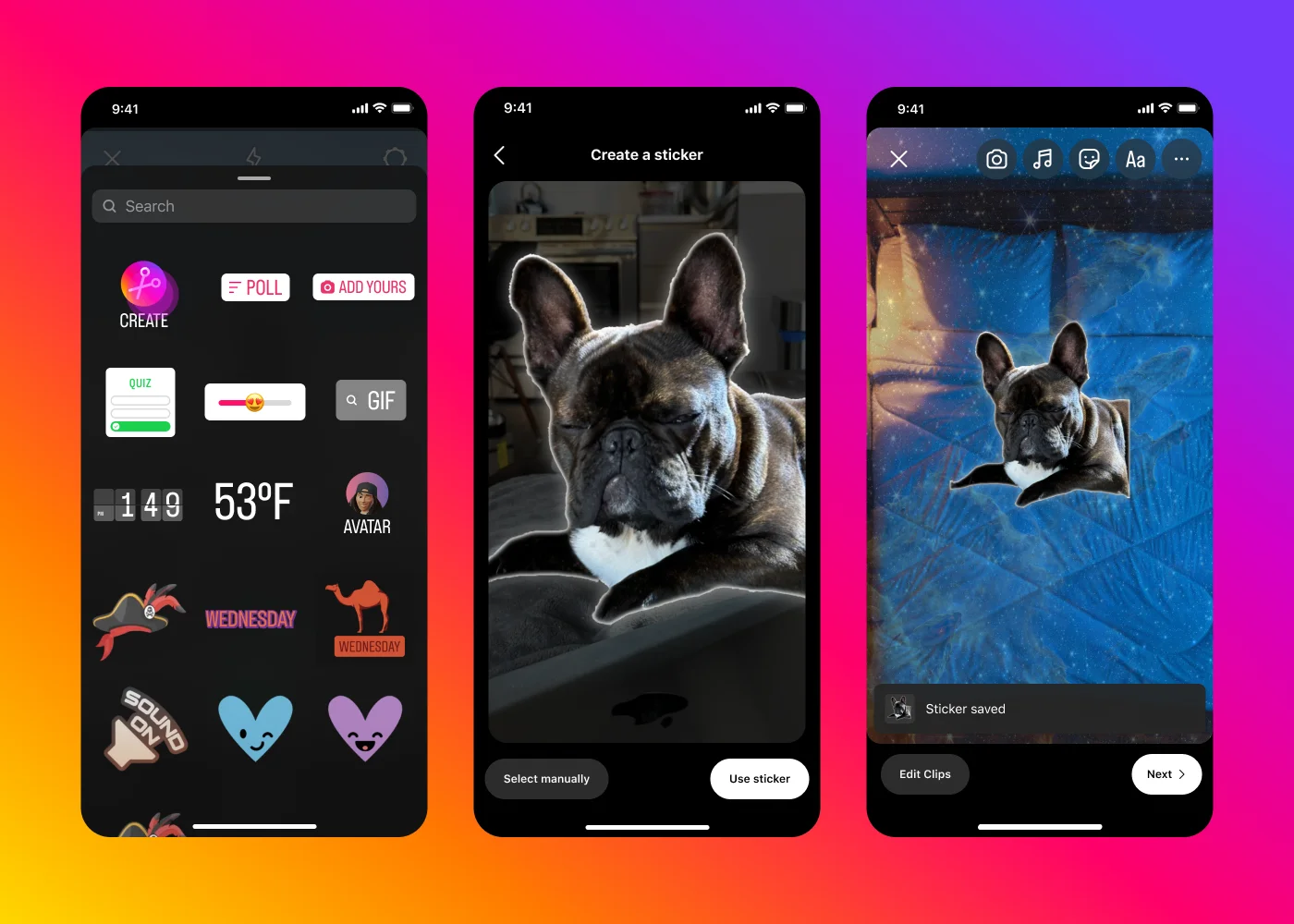 Salah satu fitur baru tersebut adalah membuat stiker dengan menggunakan bantuan dari AI. Fitur ini dibuat menggunakan model AI Segment Anything milik Meta. Stiker ini bisa dibuat melalui foto dan video yang berasal dari smartphone pengguna, ataupun melalui foto dan video yang ada di Instagram itu sendiri.