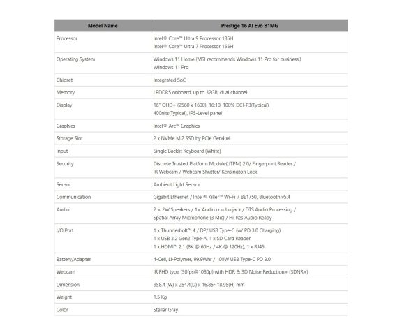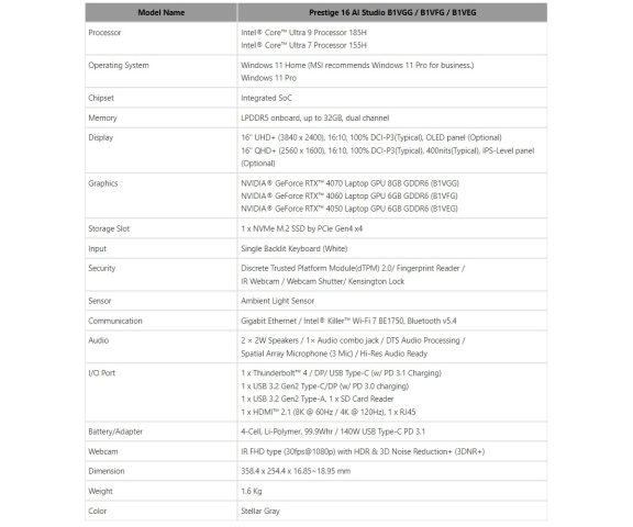Untuk detail lengkap terkait spesifikasi seluruh jajaran Prestige 16 AI Series ini dapat dilihat di gambar berikut ini.