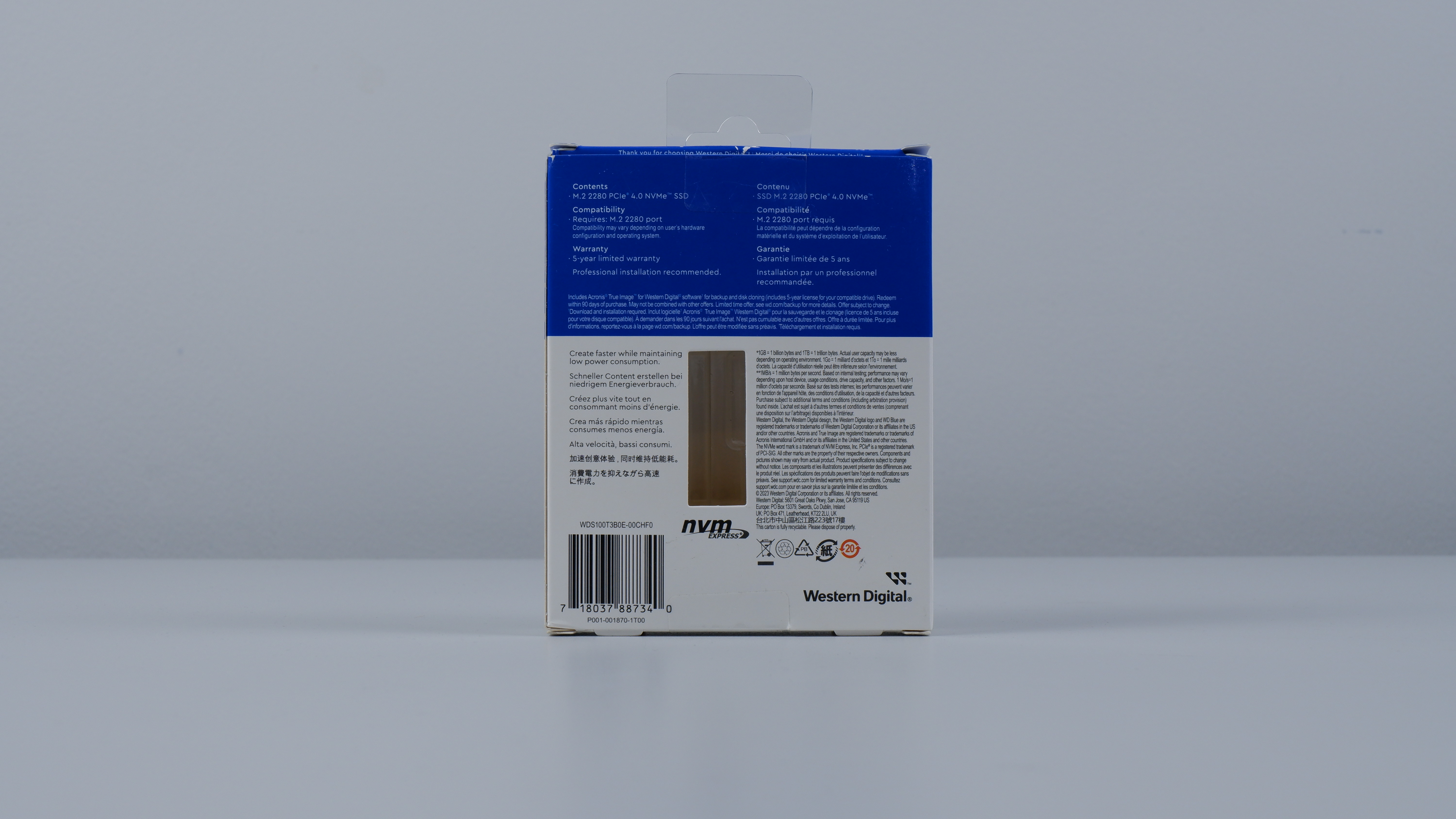 Kemudian berikut penampilan dari box SSD ini. Sesuai dengan namanya, desain dari packaging SSD ini beruansa biru, yang berarti “WD Blue”. Di sisi depan, kita akan menjumpai bentuk tampilan dari SSD ini, serta spesifikasi kuncinya.