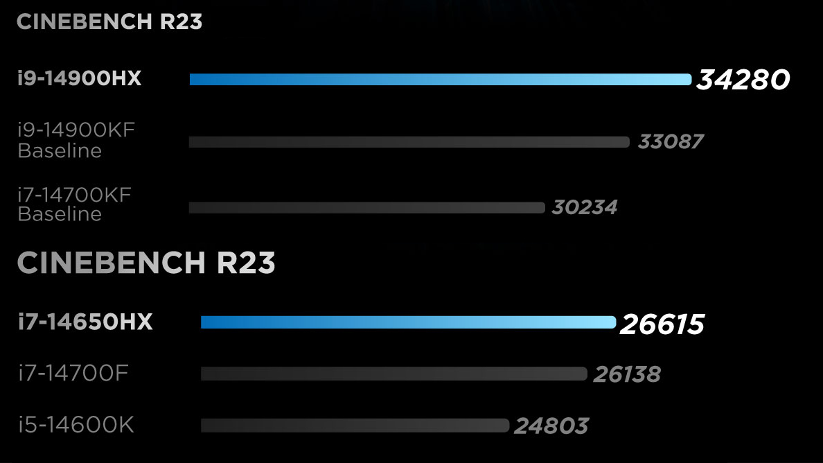 Varian yang menggunakan prosesor Core i9 14900HX memiliki clock speed sampai dengan 5.8 GHz dan TDP di angka 190 W. Sementara untuk varian yang menggunakan prosesor Core i7 14650HX memiliki clock speed sampai dengan 5.2 GHz dan TDP di angka 160 W. Untuk urusan performanya sendiri Lenovo mengklaim kalau varian yang menggunakan Core i7 14650 HX bisa melampaui performa Core i5 14600K atau Core i7 14700F dalam pengujian cinebench R23, sementara varian yang menggunakan Core i9 14900 HX bisa melampaui performa Core i9 14900KF dan Core i7 14700KF dalam pengujian serupa.
