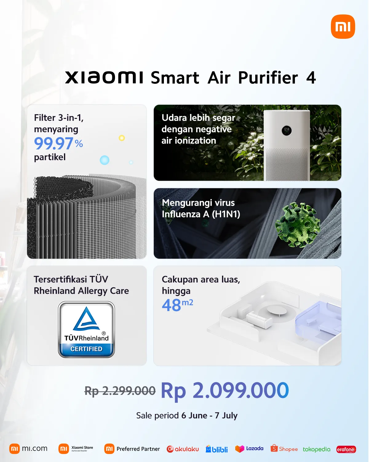 Xiaomi mengatakan Xiaomi Smart Air Purifier 4 memiliki tingkat kebisingan ternedah hingga 20,6 dB dan daya output maksimum 30W. Yang satu ini dijual dengan harga resmi Rp2.299.000 dan sudah tersedia untuk dibeli oleh masyarakat Indonesia.