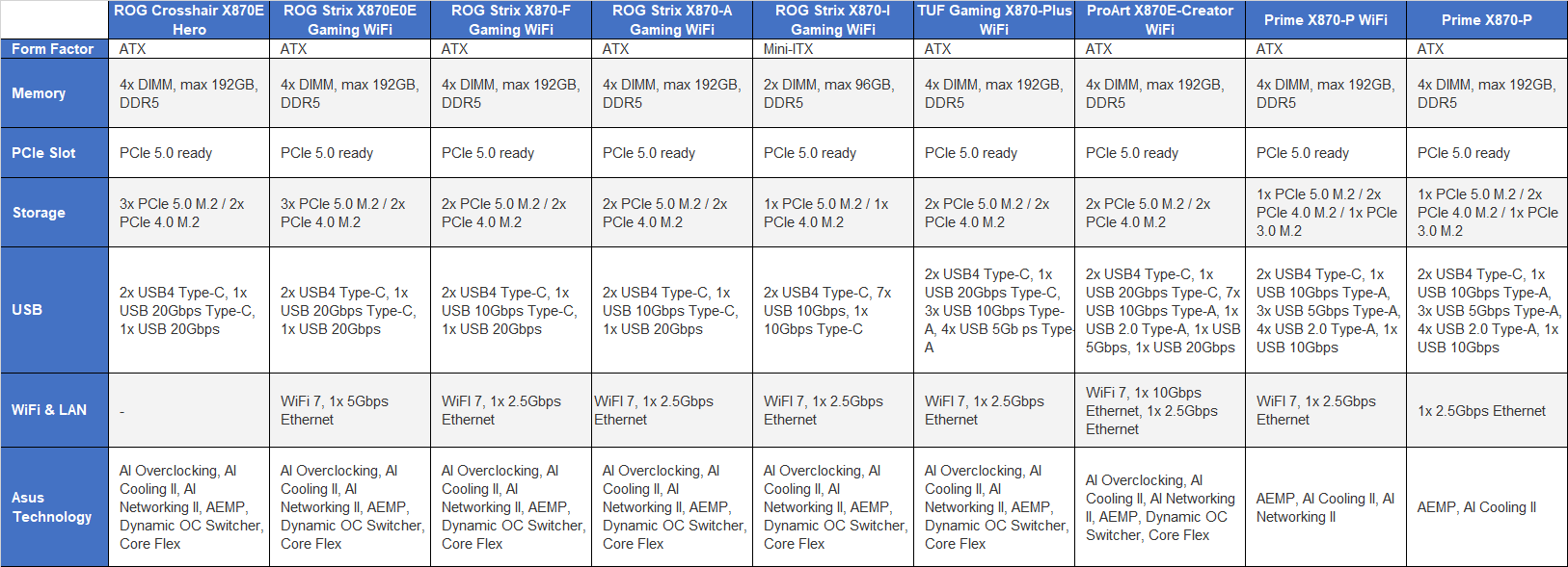 Sementara itu, semua motherboard ASUS X870/X870 yang dilengkapi dengan Wi-Fi kini sudah memiliki standar Wi-Fi 7 terbaru yang lebih kencang. Total ada 9 motherboard X870 dan X870E dari ASUS yang diperkenalkan di ajang Gamescom 2024. Daftar lengkapnya bisa dilihat pada gambar berikut di bawah ini: