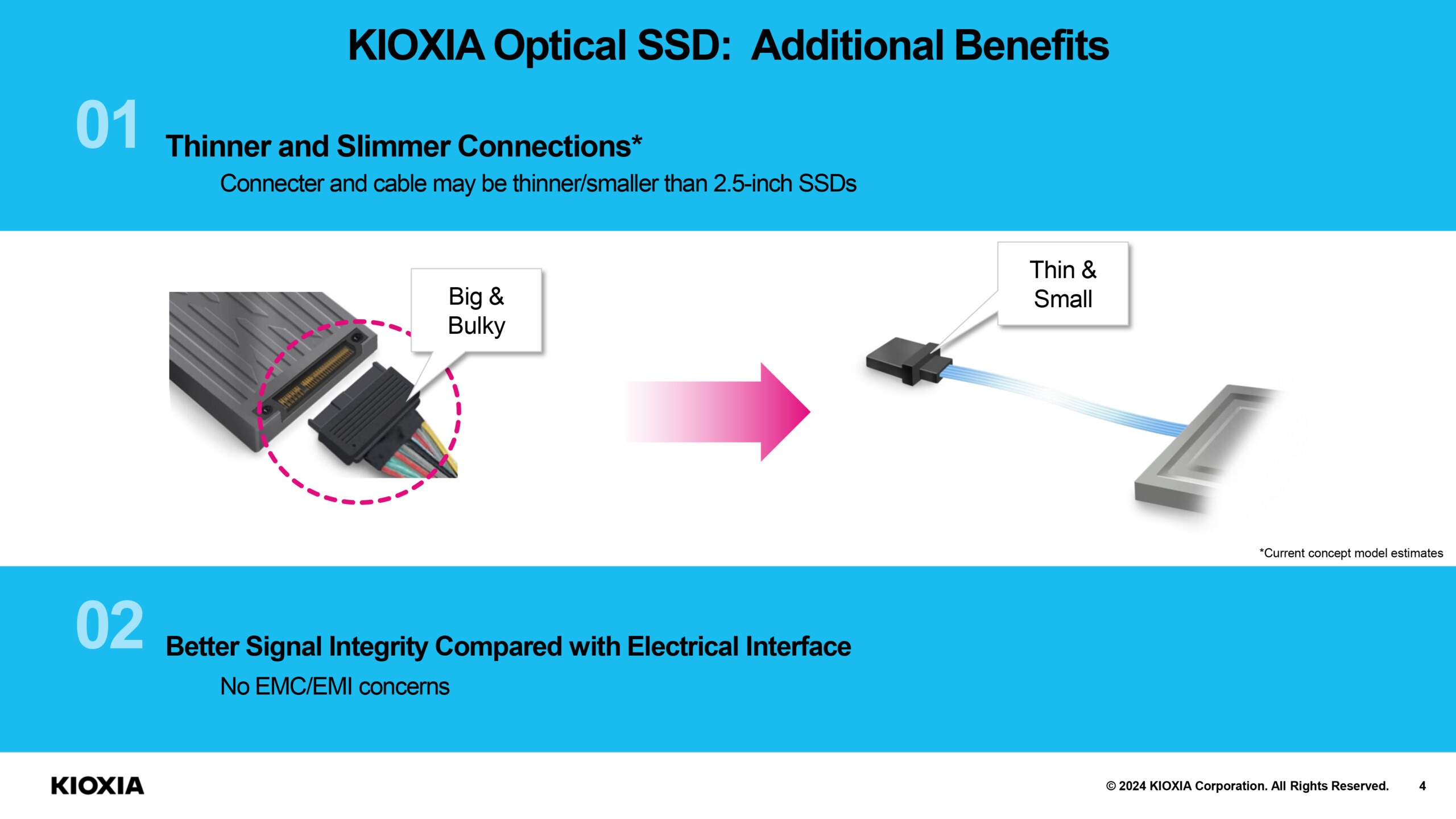 Kioxia baru saja meluncurkan SSD (Solid State Drive) terbaru yang menggunakan teknologi optik, menggantikan sinyal elektrik dengan kabel biasa, dengan laser dan kabel data optik. Teknologi ini memungkinkan data ditransfer dengan kecepatan dengan sangat tinggi, menjadikan transfer data jauh lebih cepat dibandingkan teknologi sebelumnya.