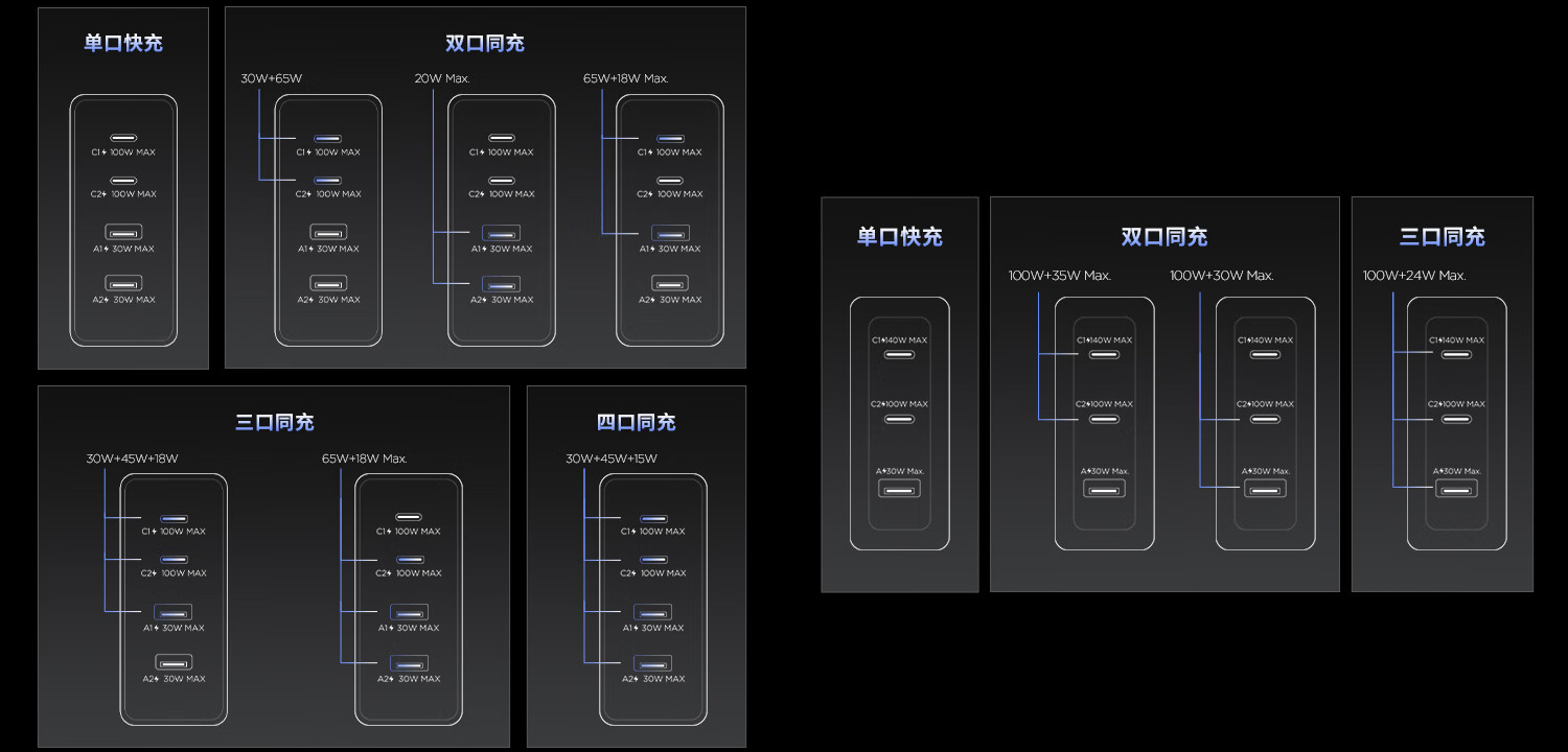 Kemudian untuk yang varian 100 W, memiliki port yang lebih banyak dengan 4 lubang USB. Port USB ini terdiri dari 2 port USB type-C dengan power output hingga 100W, ditambah dengan 2 USB port-A yang memiliki output daya maksimal 30 W. Terkait detail daya maksimal yang dapat dihasilkan oleh kedua adapter charger tersebut dapat dilihat pada gambar di bawah ini.