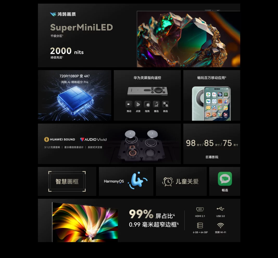 Smart TV Huawei V5 98 Inch ini menggunakan panel Super Mini LED dengan resolusi 4K, yang dikatakan memiliki tampilan cemerlang. Refresh rate nya ada di angka 120 Hz, yang membuatnya cocok juga untuk kebutuhan gaming. Untuk kecerahan layarnya, smart TV ini dikatakan memiliki typical brightness di angka 750 nits, sementara untuk peak brightness nya ada di angka 2000 nits. Sedangkan untuk color gamutnya, diklaim berada di 95% untuk DCI-P3.
