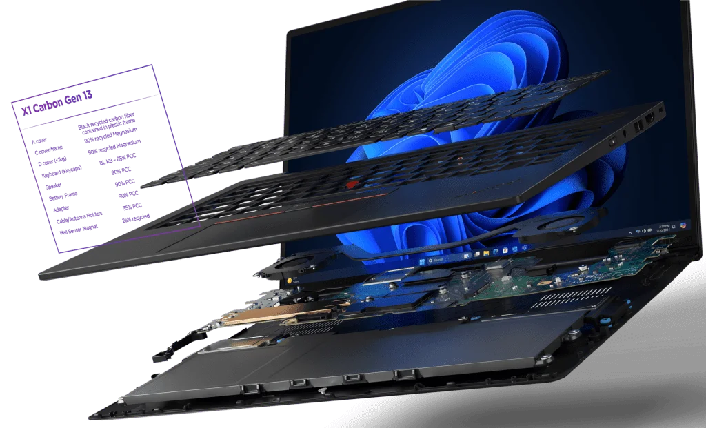 Lalu terkait penampilan, ini khas ThinkPad dengan TrackPoint di tengah keyboard tiga tombol klasik di bagian touchpad. Selain itu, Lenovo menyebutkan jika ThinkPad X1 Carbon Gen 13 Aura Edition ini akan tersedia opsi yang menggunakan Haptic TouchPad. Masih terkait desain, Lenovo ThinkPad X1 Carbon Gen 13 Aura Edition disebut menggunakan bahan yang terdiri dari 90% magnesium daur ulang untuk bagian C cover, dan packaging 100% bebas plastik yang menggunakan bahan dari bambu dan tebu. Tak sampai di sana, laptop ini juga memiliki sertifikasi seperti EPEAT Gold 9 dan ENERGY STAR 9.0.