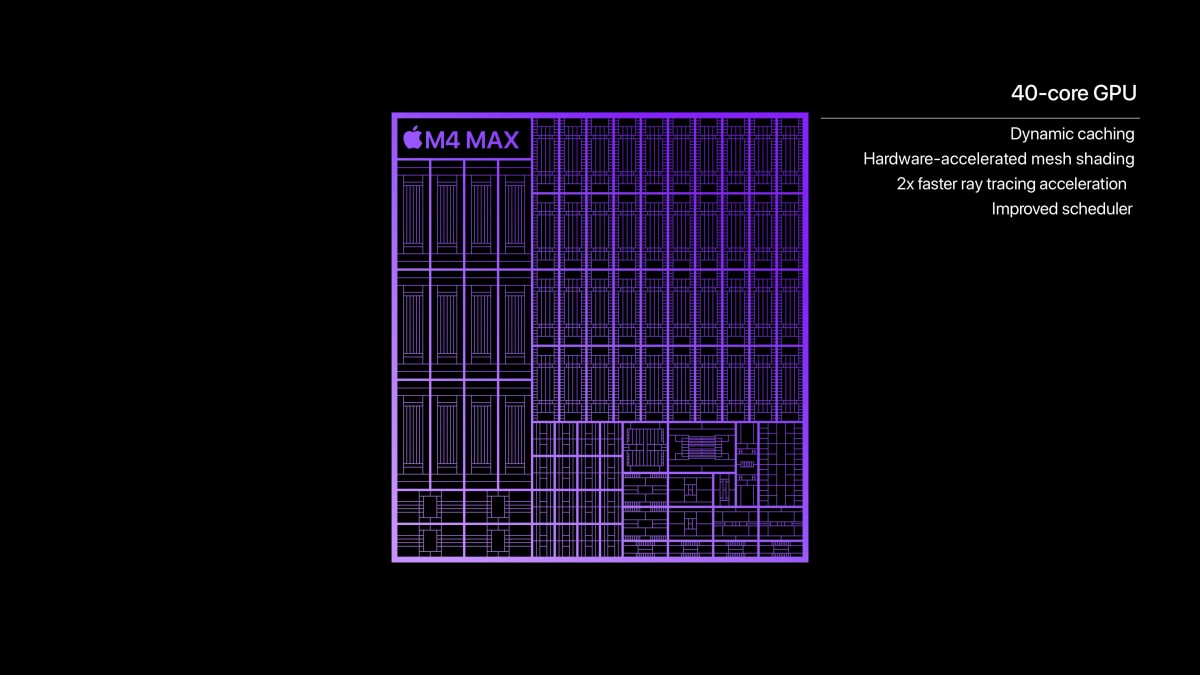 Sementara itu, chip M4 Max menghadirkan CPU dengan 16 core (12 core performa tinggi dan 4 core efisiensi) yang lebih bertenaga. Chip ini diklaim 2,2 kali lebih cepat dari M1 Max dan 2,5 kali lebih cepat dari Intel. GPU di M4 Max dilengkapi hingga 40 core, menawarkan kinerja grafis 1,9 kali lebih cepat dari M1 Max dan hingga 4 kali lebih cepat dari chip Intel.
