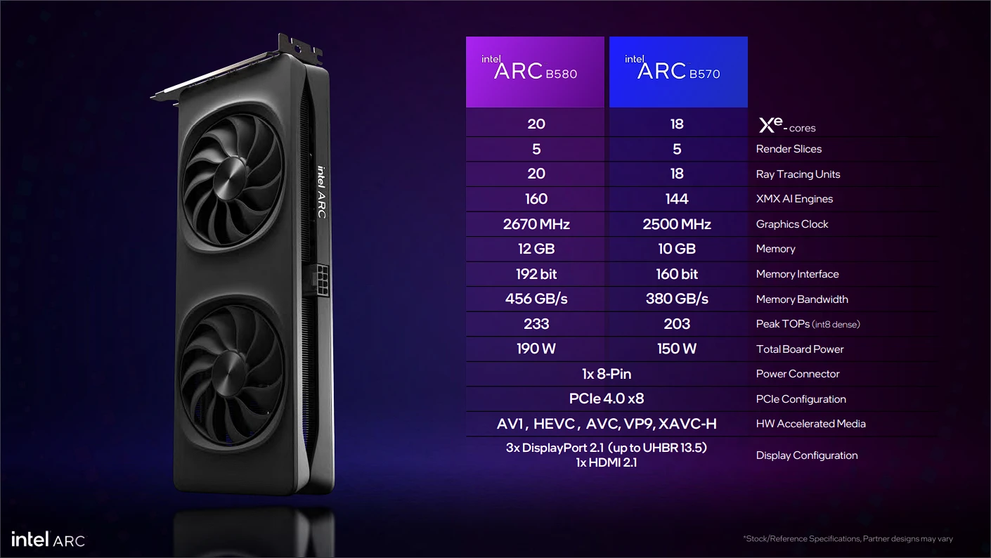Intel juga meluncurkan model Arc B570 dengan 18 Xe2-core, GDDR6 10GB dan memori bus 160-bit, sementara bandwidth maksimalnya sampai 380 GB/s. Arc B570 punya boost clockspeed hingga 2.6 GHz dan membutuhkan daya 150W. Owh iya, keduanya sama-sama pakai interface PCIe 4.0 x8 dan mendukung DisplayPort 2.1 (UHBR13.5).