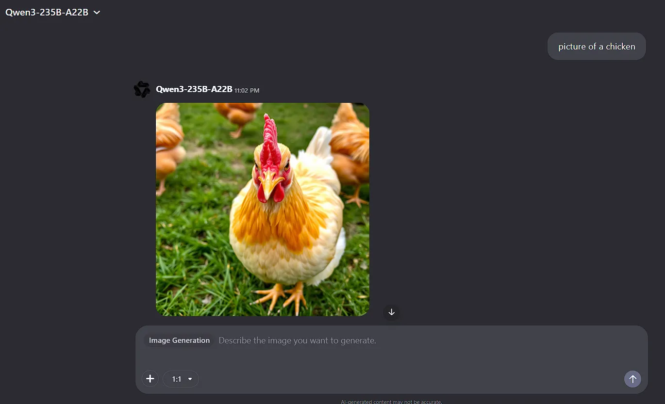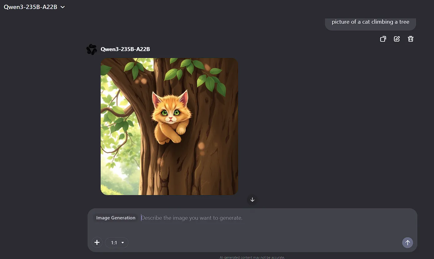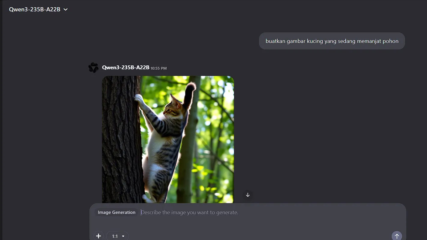 Nama teknis dari Qwen VLo adalah Qwen3-235B-A22B yang dapat dipilih lewat model selector di pojok kanan atas. Model tersebut mendukung text-to-image untuk menghasilkan gambar dengan prompt teks serta image-to-image untuk membuat gambar AI dari gambar yang diupload oleh pengguna.