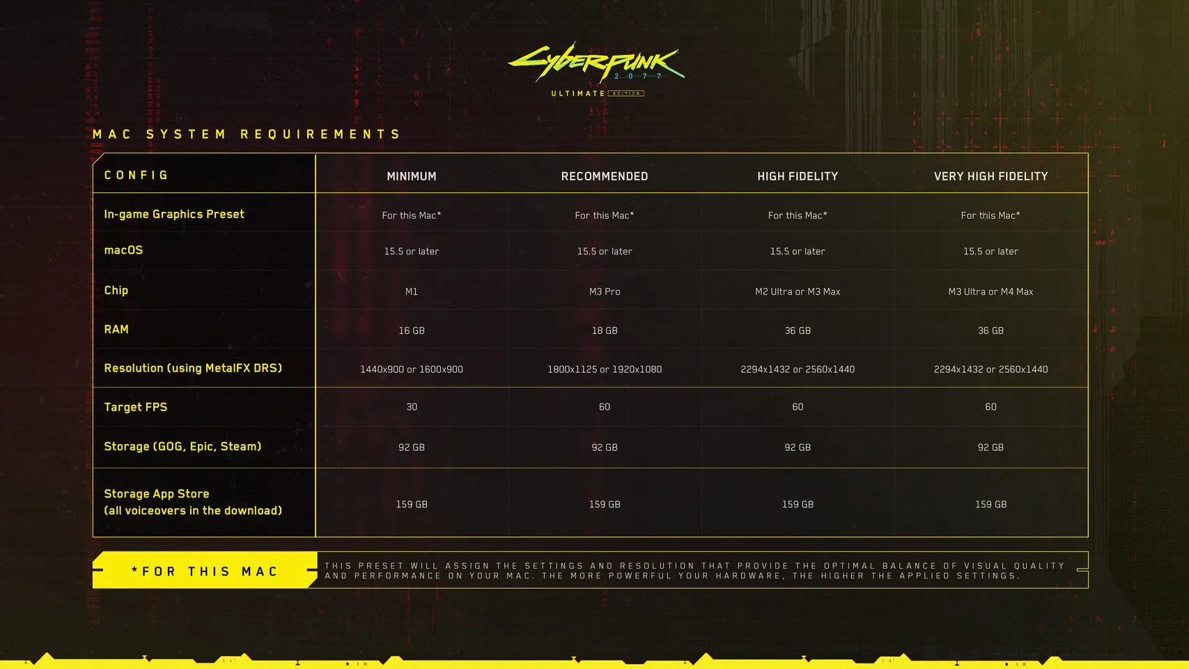Meski mampu dijalankan, akan tetapi dengan chip M1 mendapatkan setting paling minimum yakni pada resolusi 1440 x 900 di 30fps atau 1600×900 dengan bantuan upscalling MetalFX DRS dengan catatan konfigurasi memori setidaknya 16GB. Untuk mendapatkan sweet spot resolusi 1080p di 60fps, CD Projekt RED merekomendasikan chip M3 Pro atau yang lebih baru dengan memori minimal 18GB.