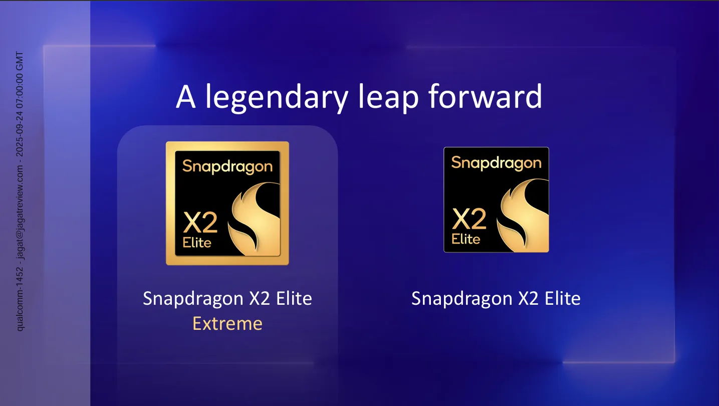 Snapdragon X2 Elite Extreme (X2W-96-100) jadi varian tertinggi kali ini, dengan konfigurasi CPU 18-core terdiri dari 12-core prime di 4.4 GHz dan 6-core performa di 3.6 GHz. SoC ini memiliki dual-core boost frekuensi hingga 5.0 GHz dan total cache 53MB. Peningkatan performa dari sisi CPU diklaim hingga 31% dari pendahulunya.
