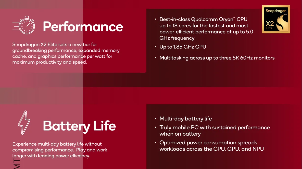 Ya, Snapdragon X2 Elite Series membawa NPU Qualcomm Hexagon 80 TOPS, terkencang di dunia saat ini di segmen mobile, dirancang untuk menawarkan pengalaman AI Copilot+ PC secara maksimal. Sementara itu, menggunakan core Oryon generasi ke-3 yang sudah memanfaatkan teknologi proses 3nm, lini X2 Elite juga diklaim 43% lebih efisien dari generasi sebelumnya.