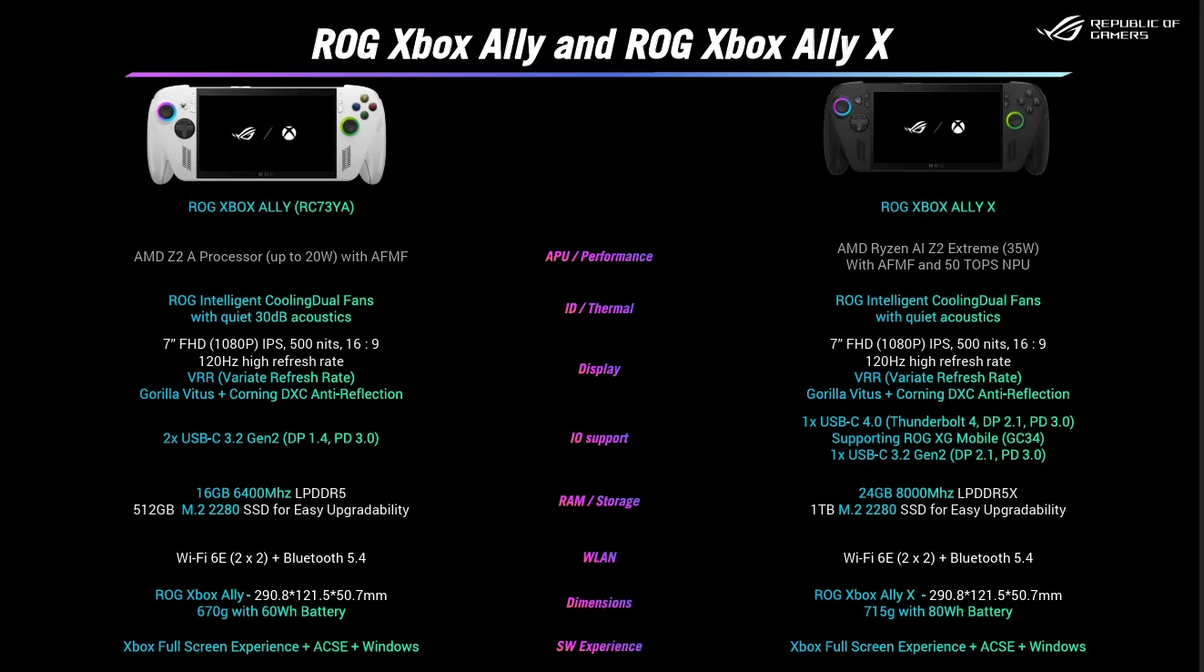 Namun, dari spesifikasi jeroan cukup berbeda. ROG Xbox Ally X membawa APU AMD Ryzen AI Z2 Extreme dengan TDP 35W dan NPU 50 TOPS. Dibekali RAM LPDDR5X 24GB 8000Mhz dan storage SSD M.2 2280 berkapasitas 1TB. Konfigurasi ini diklaim mampu menawarkan gameplay mulus di resolusi 900-1080p.