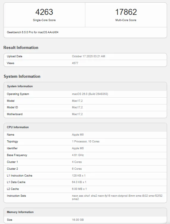 M5 sendiri mengusung CPU 10-core, terdiri dari 4-core performa dan 6-core efisien. Dari hasil benchmark Geekbench 6, M5 mencatatkan skor single-core di 4.263 poin. Angka tersebut tertinggi dalam database Geekbench 6 sejauh ini baik untuk Mac maupun PC, mengungguli M4 Max (3.914) hingga flagship AMD Ryzen 9950X3D (3.399).